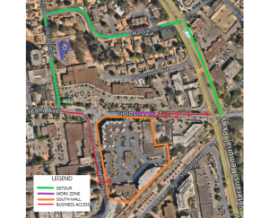Traffic control personnel will be on-site during working hours to facilitate vehicles’ and pedestrians’ access to local businesses in the affected area. Please follow the RED route during construction if accessing businesses and please follow the GREEN detour route during construction if not accessing businesses and expect delays.